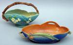 #226: TWO ROSEVILLE POTTERY BOWLS The one a basket with white blossoms & arched faux