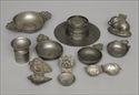 Including an inkwell with hinged top and disc base, a sander, a two-handled bowl, a wine taster, two porringers and four food molds in the forms of a boar, a pie, a bunch of grapes and a walnut; 2 5/8 to 7 5/8 in.