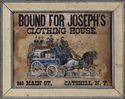 With illustration of a stage coach and lettering "BOUND FOR JOSEPH'S/CLOTHING HOUSE./263 MAIN ST., CATSKILL, N.Y.," framed. Together with a painted wood trade sign with lettering "Goat Milk for Sale" and a Currier and Ives lithograph, "Schmidt's Horse and Cattle Powder"; advertisement 11 1/2 x 15 1/2 in.