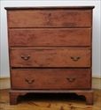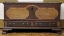 The rectangular molded hinged lid over conforming well with till, above two drawers flanked by molded panels, the front painted with two shaped panels, inscribed "Elisabeth Gackli 1798," on ogee-bracket feet; 28 1/2 x 51 3/4 x 23 1/2 in. Note: A family with the surname of Caquelin settled in Pennsylvania in the early 18th century and spread to numerous counties including Berks, Lancaster, Franklin, Cumberland and Lebanon. Later generations and different branches of the family spelled the name variously as Cockley, Gockley, Cocklin, Gackley and Gackli.