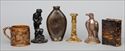 Including a book-form bottle, a frog mug and a lion-form candlestick. Together with a flint-enamel candlestick, a brown-glazed bottle and a glazed terracotta bird-figure; 4 to 10 1/4 in.
