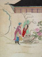 #544: CHINESE PAINTED SILK PICTURE OF A GIRL WITH FLUTE & BEARDED TEACHER, ON A BENCH