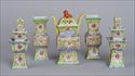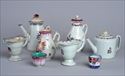 Including a teapot, coffee pot, two milk jugs (one with unassociated cover), two helmet-form cream pitchers and two tea bowls; tallest 6 x 6 in.