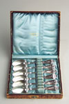set with porcelain handles; six silver plated iced tea spoons;