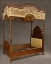 The breakarch crewelwork-hung canopy raised on spiral-twist and block legs, with scalloped and padded headboard and padded footboard, on ring-turned and half-bun feet; 9 ft. 5 in. x 4 ft. 7 1/4 in. x 7 ft. 2 in. Provenance: Property from the Childs family collection, removed from “Florham,” Madison, New Jersey, the 100-room mansion designed by McKim, Mead & White for Florence Vanderbilt Twombly and her husband, Hamilton Twombly. The building is now part of Fairleigh Dickinson University.