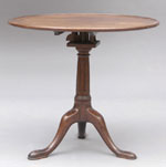 #31: GEORGE III MAHOGANY TRIPOD TABLE The dish top above a birdcage support raised on a fluted and turned stem on cabriole legs and pad feet; 28 1/2 x 31 3/4 in.