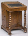 #36: VICTORIAN BURL WALNUT DAVENPORT DESK The 3/4 in. gallery above a leather lined slant-front opening to 2 small drawers, above a lateral writing drawer & 4 drawers, spiral twist legs; 31 1/2 x 21 1/4 x 22 in.