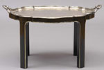 #38: VICTORIAN SILVER-PLATE TRAY ON STAND The shaped top chased with foliage above a conforming base with silver highlights; 18 x 34 1/4 x 25 in. Provenance: Cafe Royale, London.