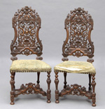 #39: PAIR OF WILLIAM & MARY-STYLE CARVED WALNUT SIDE CHAIRS Each carved top rail above pierced back, the nailed seats on shaped legs joined by carved H-stretcher; 4 ft. tall.