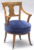 The inward curved cresting rail above oval back splat, above upholstered seat, ending in tapered legs, the cresting & back splat ending in brass; formerly a fauteuil bureau de cabinet; 34 x 21 1/2 x 22 in. Estimate: $ 300.00 - $ 500.00 Sold at $ 950.00
