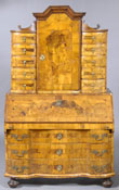#98: GERMAN MARQUETRY WALNUT AND CHERRY INLAID BUREAU CABINET 18TH C., The upper section fitted with a central door opening to reveal a drawer, the door flanked by 5 drawers above a lower section with a fall-front opening to reveal a baize-lined writing surface and an interior fitted with drawers; the whole raised on bun feet, 78 x 46 x 24 in. Estimate: $ 5000.00 - $ 7000.00 Sold at $ 5,500.00