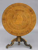 #100: ITALIAN CIRCULAR MARQUETRY TRIPOD TABLE The circular top inlaid with figures surmounted by parquetry inlay raised on a turned stem ending in shaped and turned legs; 31 x 35 in. Estimate: $ 800.00 - $ 1200.00 Sold at $ 1,400.00