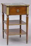 #111: LOUIS XVI-STYLE BRASS MOUNTED MAHOGANY OCCASIONAL TABLE The marble paneled top with outset corners, above a drawer & two banded shelves, on tapered legs; 31 3/4 x 19 1/4 x 19 1/4 in.