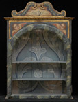 #112: CONTINENTAL ROCOCO HANGING VITRINE Painted & marbelized. The swan's neck pediment centering a dove above an arched glass door flanked by cherub heads, opening to two shelves, the sides with two diamond marble panels, 29 1/2 x 21 x 8 1/2 in. Estimate: $ 400.00 - $ 600.00 Sold at $ 775.00
