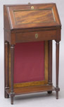 The paneled slant-front above a frieze drawer, on tapered fluted legs joined by a shelf, backed by a pull-up fabric-lined fire screen; 34 x 19 x 9 in. Estimate: $ 400.00 - $ 600.00 Sold at $ 400.00