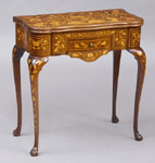 #118: DUTCH ROCOCO-STYLE MARQUETRY INLAID WALNUT GAMES TABLE The serpentine fronted folding top opening to a paneled surface above a drawer at the front & at the right side & raised on cabriole legs ending in claw & ball feet; 29 1/4 x 28 1/2 x 14 in.