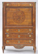 #119: LOUIS XV/XVI TRANSITIONAL SECRETAIRE A ABATTANT The rectangular case fitted with a drawer above a fall-front opening to reveal a fitted interior; the interior above a leather top, ending in short cabriole legs. Losses to veneer, lacking marble top & key, rip in leather, 55 1/2 x 35 x 13 3/4 in. Estimate: $ 2000.00 - $ 3000.00 UNSOLD
