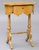 #285: GOTHIC BIEDERMEIER WORK TABLE The shaped top above a frieze fitted with a drawer and gothic pendants, raised on turned supports and ending in four S-shaped legs; 31 x 25 1/2 x 16 1/2 in. Estimate: $ 500.00 - $ 700.00 Sold at $ 800.00