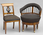 #288: BIEDERMEIER SYCAMORE LOW TUB-BACK ARMCHAIR AND A SIDE CHAIR The top rail upholstered at the front, above ebonized spindles, the seat on tapered legs with brass casters; 32 x 26 x 22 in. Estimate: $ 500.00 - $ 700.00 Sold at $ 900.00