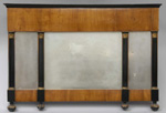 #294: BIEDERMEIER OVERMANTLE MIRROR Birch, ebonized wood & parcel-gilt; the 3-part plate spaced by 1/2 round pilasters with tiered leaf capitals & the base on leaf capped bun feet; 32 x 46 1/2 in. Estimate: $ 800.00 - $ 1200.00