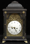 #295: BIEDERMEIER EBONIZED WOOD BRACKET CLOCK The 4 1/2 in. enameled dial on repoussé brass break arch plate with drapery swags, fruit & oval cartouche; the movement with crown escapement, the case with tiered dome top & chip carved door; on ogee bracket feet, 13 3/4 x 8 1/4 x 5 1/4 in. Estimate: $ 600.00 - $ 800.00 Sold at $ 375.00