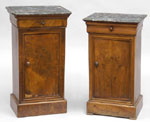 #300: TWO SIMILAR BIEDERMEIER MARBLE TOP WALNUT NIGHT STANDS The marble tops above shaped drawer & a door opening to shelves on plinths, one with feet. 30 X 16 X 14 in. & 28 X 16 X 13 3/4 in. Estimate: $ 600.00 - $ 800.00 Sold at $ 350.00