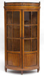 #302: BIEDERMEIER-STYLE MARQUETRY INLAID FRUITWOOD CORNER CABINET Of bow front outline, the frieze with putto & vinework, above a pair of 6-pane glazed doors with ebonized moldings, paneled lower doors, on S-form feet; 6 ft. 2 1/2 in. x 37 1/2 in. x 28 in. Estimate: $ 700.00 - $ 900.00 Sold at $ 750.00