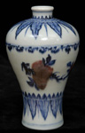 #306: CHINESE RED AND BLUE PORCELAIN VASE The pear-form footed vase with underglaze decoration, brown glazed rim, 4 character mark; 10 in. tall. Estimate: $ 300.00 - $ 500.00 Sold at $ 200.00