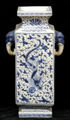 #309: CHINESE BLUE AND WHITE PORCELAIN ANGULAR VASE With six character reign mark; 13 1/2 in. tall. Estimate: $ 150.00 - $ 250.00 Sold at $ 325.00