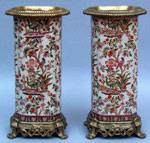 #284: PAIR OF FAMILLE ROSE-STYLE BRASS MOUNTED VASES 17 1/4 in. tall. Estimate: 400.00 - 600.00 Sold at $600.00