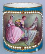 #287: SEVRES PORCELAIN CUP WITH JEWELED DECORATION An oval scene within pearlwork surrounded with