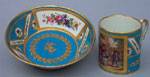 #290: SEVRES PORCELAIN CUP & SAUCER, BY L. GRISEE The cylindrical cup with hand-painted scene entitled, "L' heureuse mere," on blue celeste