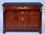 #372: EMPIRE ORMOLU MOUNTED MAHOGANY COMMODE The black & white fossilized marble top above a case fitted with 4 long drawers flanked by ormolu
