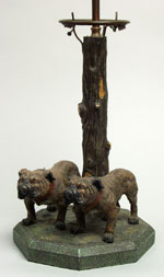 In the form of 2 bull dogs tethered to a tree, on