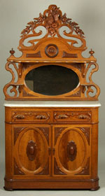 cresting above a shelf and an oval mirror plate; the rectangular